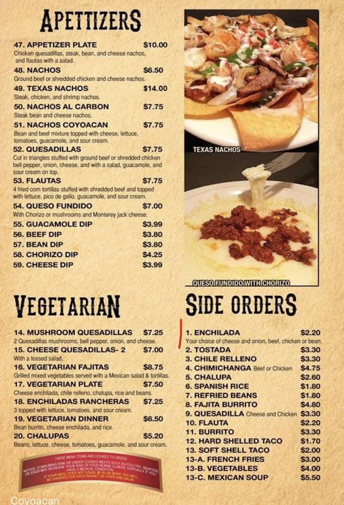 Coyoacan boasts an extensive menu, featuring 77 dishes, each made with care. From appetizers like nachos to hearty entrees like carne asada, there’s something for everyone. Vegetarians can delight in mushroom quesadillas or vegetarian fajitas. The house specialties include delectable alambres and traditional tacos al pastor. Desserts and drinks round out the experience, ensuring every palate is satisfied.